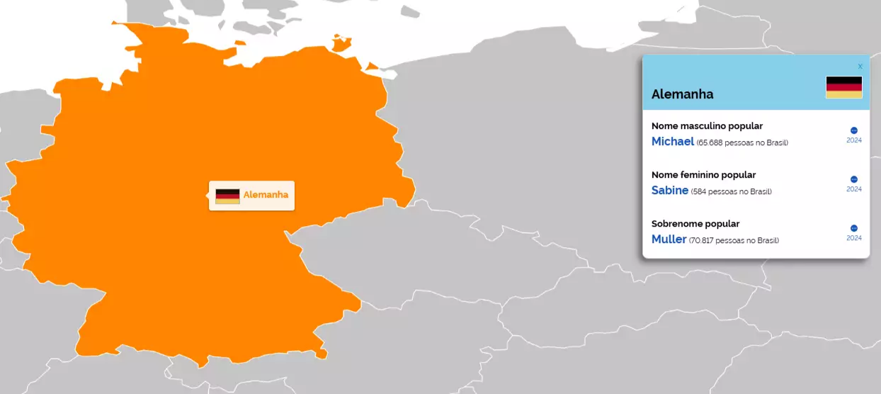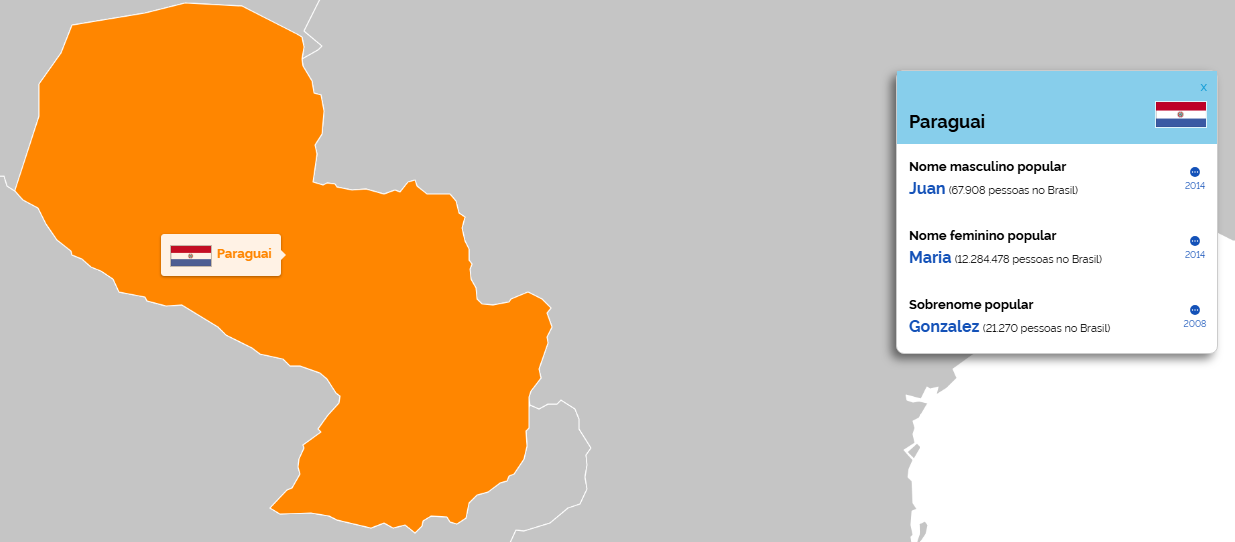 Outra novidade do site é o mapa-múndi "Nomes no Mundo", onde é possível explorar os nomes e sobrenomes mais comuns em diferentes países. A ferramenta permite comparar a popularidade de certos nomes no Brasil com os dados internacionais. Por exemplo, ao selecionar China, é possível descobrir que o sobrenome Wang é o mais comum, com 1.513 pessoas registradas com esse sobrenome no Brasil. Na Bolívia, os nomes mais frequentes são Juan e Juana, com 67.908 e 3.113 registros no Brasil, respectivamente.