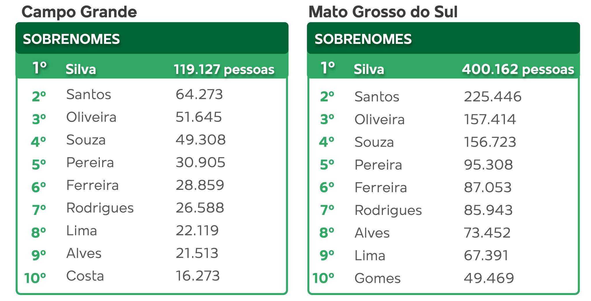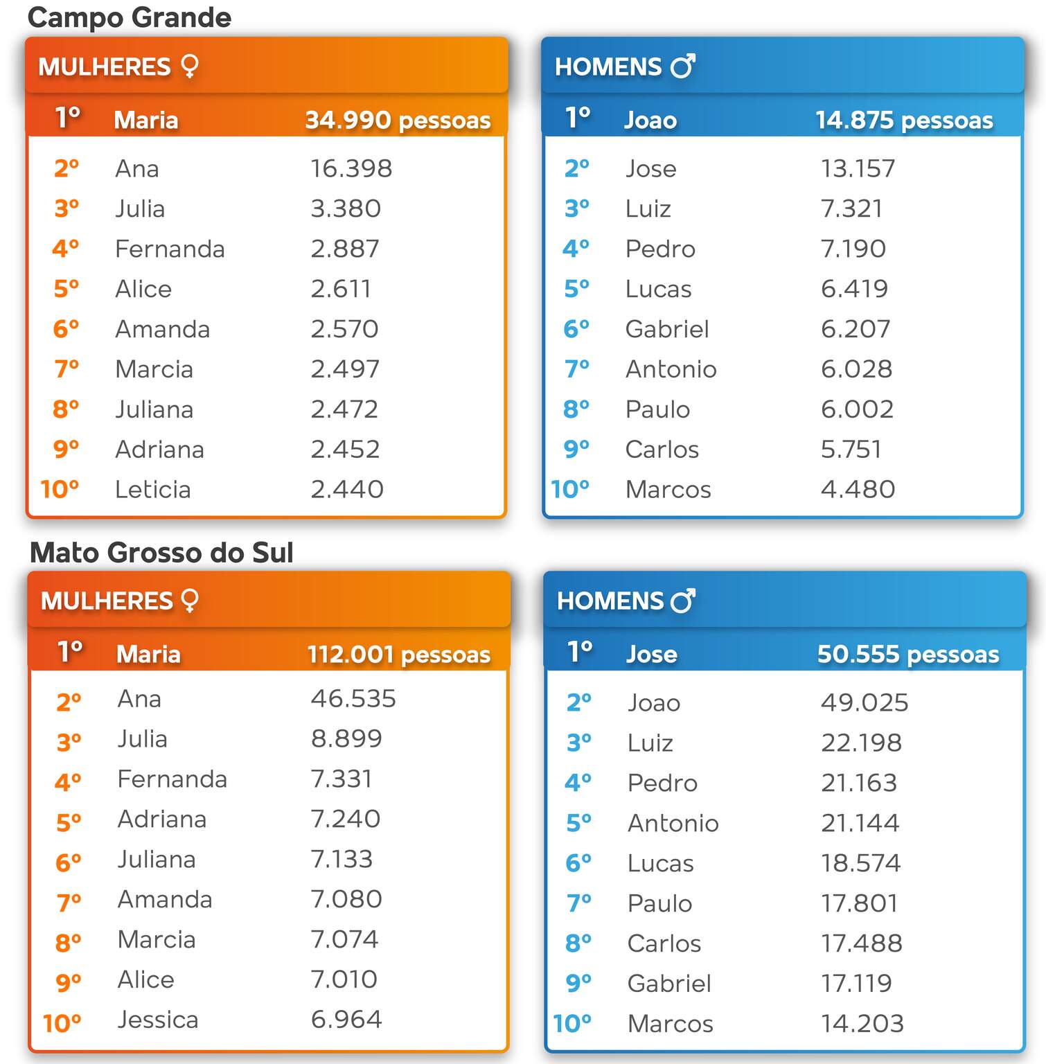 Em Mato Grosso do Sul, por exemplo, os clássicos ainda resistem: Maria, Ana, João e José, nada de novo, porque os dados contemplam a população em geral, não as modinhas que ganharam os cartórios recentemente. O divertido agora é que o sistema possibilita descobrir onde vivem seus parentes. A grande novidade nesta edição é a inclusão dos sobrenomes, permitindo um panorama ainda mais completo sobre a distribuição pelo Brasil.