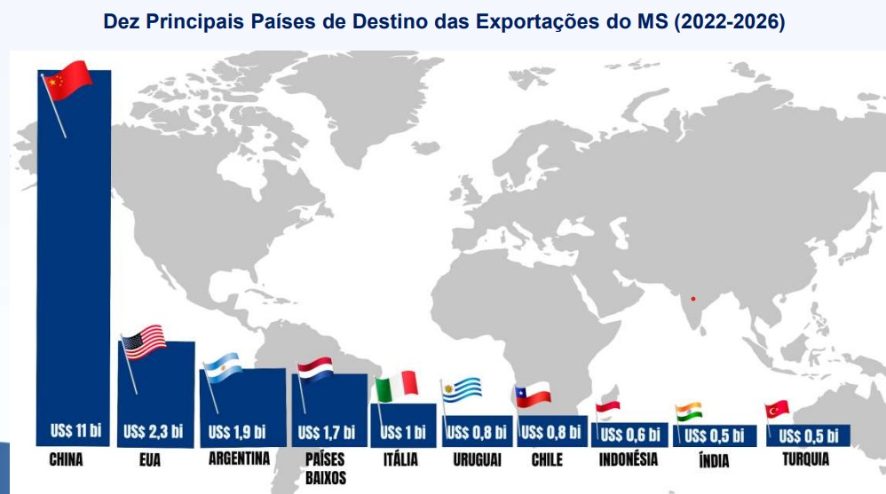 A China já é o principal destino das exportações de Mato Grosso do Sul, tendo absorvido cerca de US$ 11 bilhões em produtos do Estado entre 2022 e 2026, o equivalente a aproximadamente 37% das vendas externas.
