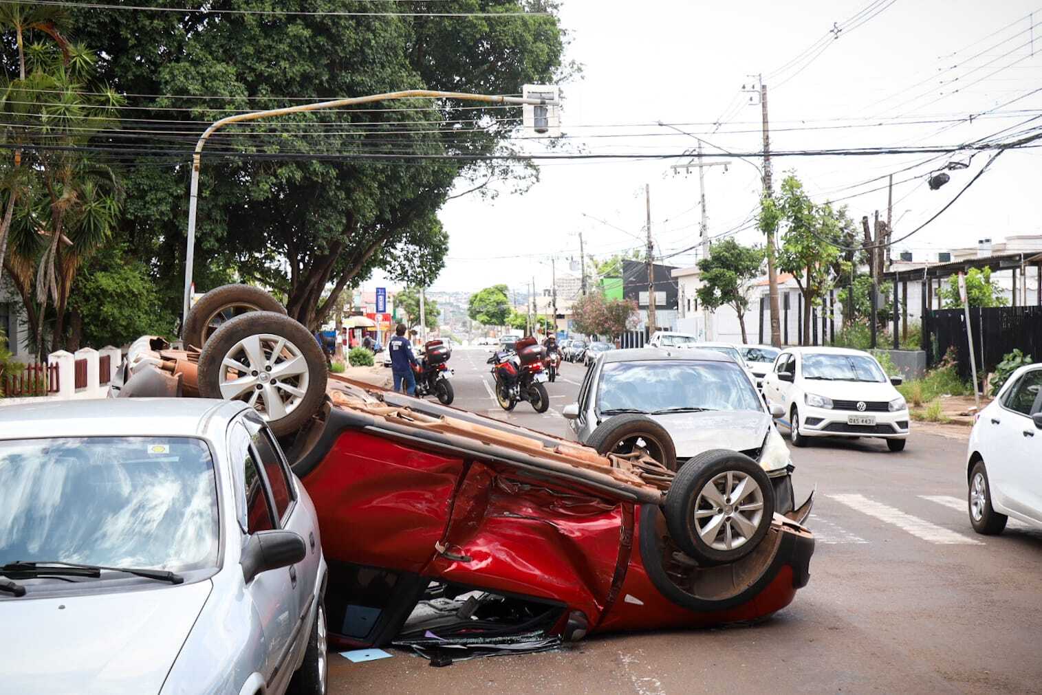 Um acidente envolvendo três carros deixou o trânsito lento no fim da manhã desta quarta-feira (28) no cruzamento da Rua Marco Polo com a Avenida Calógeras, na Vila Carvalho, em Campo Grande. Um dos carros capotou após a colisão e ainda atingiu outro veículo que estava estacionado.