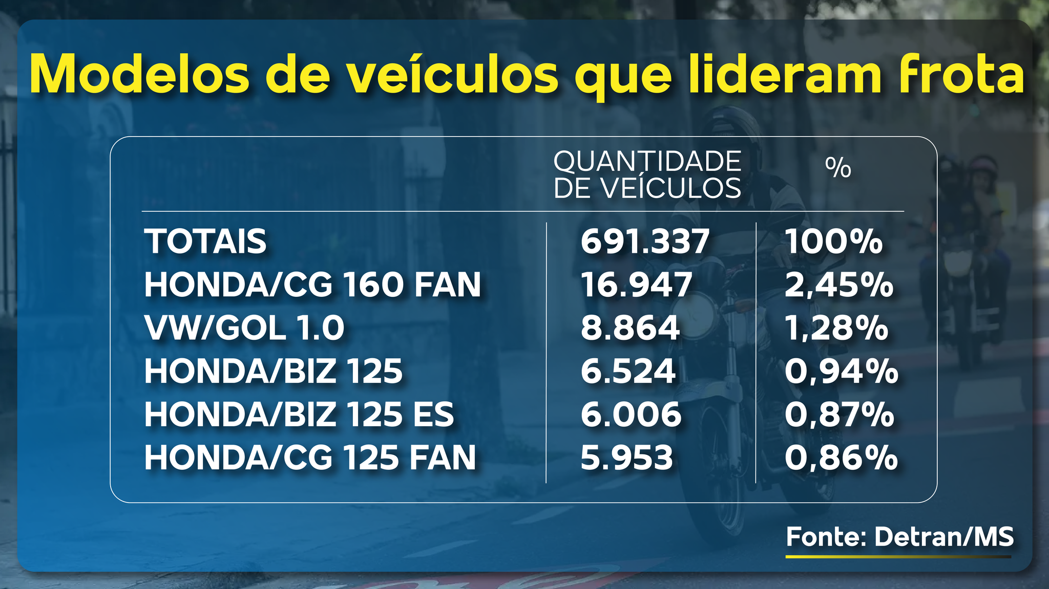 Campo Grande tem frota de 691.337 veículos, liderada pelos modelos Honda/CG 160 Fan e Volkswagen Gol 1.0. Os dados são do Detran/MS (Departamento Estadual de Trânsito).