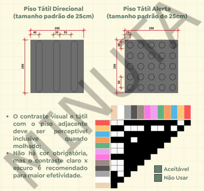 Pela primeira vez, o guia também traz orientações específicas sobre cores do piso tátil. Não há exigência de cor única, mas o documento recomenda contraste visual claro e escuro em relação ao piso adjacente, inclusive em condições de chuva, para atender pessoas com baixa visão.