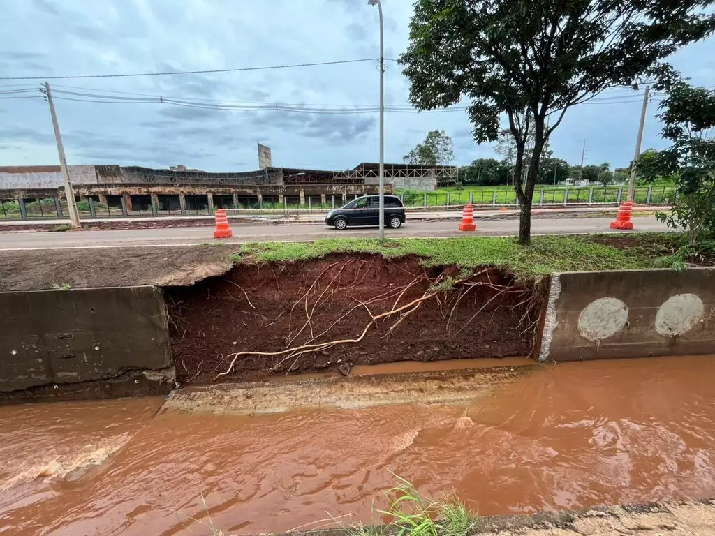 Parte da contenção do Córrego Segredo, na Avenida Ernesto Geisel em Campo Grande, desabou novamente em menos de um mês, levando consigo uma porção do asfalto. O incidente ocorreu durante o temporal do dia 7 de janeiro, agravando o solapamento na região. A Agetran informou que as chuvas constantes impedem o início das obras de recuperação. Apesar da interdição parcial em frente ao Centro de Belas Artes, o trânsito continua fluindo. Equipes trabalham na remoção dos resíduos e destroços no local.