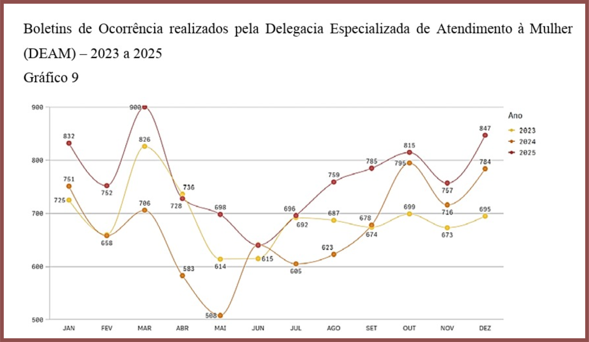 Já sobre os boletins de ocorrência na Deam, o dossiê indica que o maior número de ocorrências foi registrado em março, com 900 boletins, seguido por dezembro, com 847, e outubro, com 815 registros. Mesmo no período de menor volume, em junho foram contabilizados 640 casos, o que mantém a média mensal acima de 700 registros.