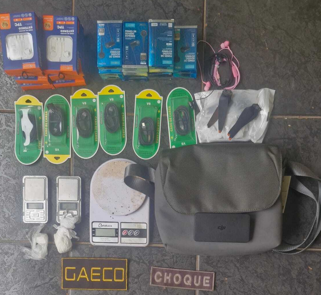 O nome do funcionário ou função não foram divulgados. No local, cerca de 70 pacotes foram apreendidos com produtos ilícitos, além de balanças, celulares e acessórios de comunicação.