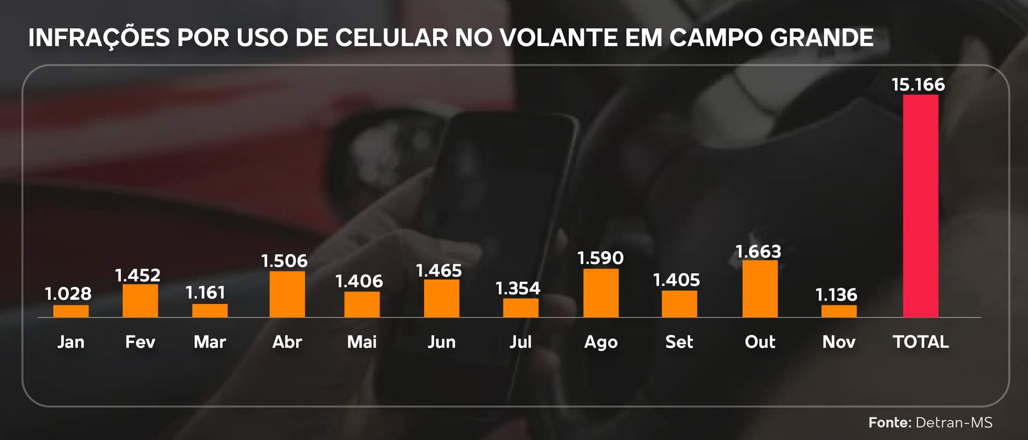 Conforme dados do Detran-MS (Departamento Estadual de Trânsito), de janeiro a novembro de 2025 já foram contabilizadas 27.041 multas por uso de celular ao volante. No ano passado, o número foi 36.663.