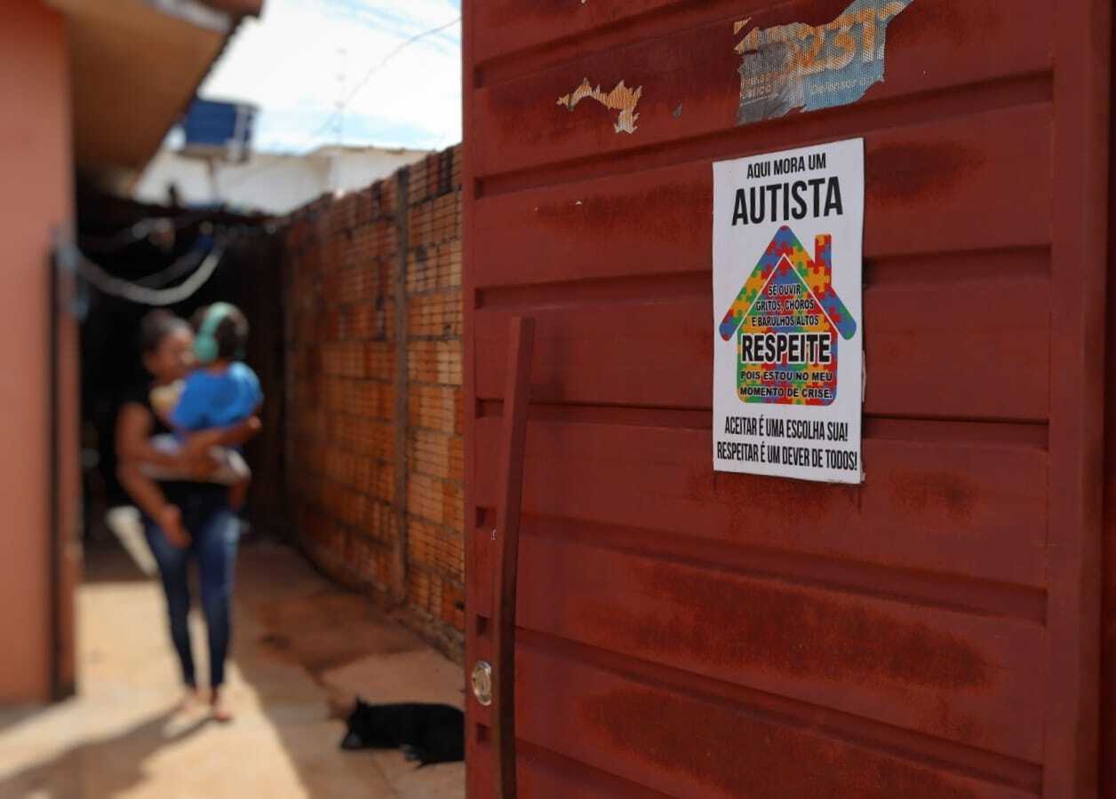 Com uma placa em frente de casa, a mãe tenta conscientizar e esclarecer os vizinhos. O aviso é de que as crises são marcadas por gritos e choro. Para proteger o menino do barulho, comprou um abafador de ruído.