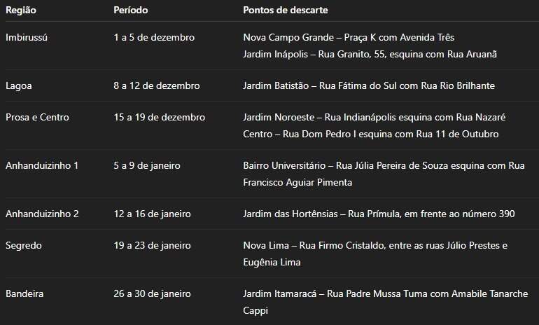 A abertura será às 8h, na Rua Dr. Alfredo Aurélio de Castro, 748, no Nova Campo Grande, em frente à Escola Municipal Professor Ernesto Garcia de Araújo. A partir daí, a ação segue um calendário de sete etapas para atender todas as regiões da Capital.