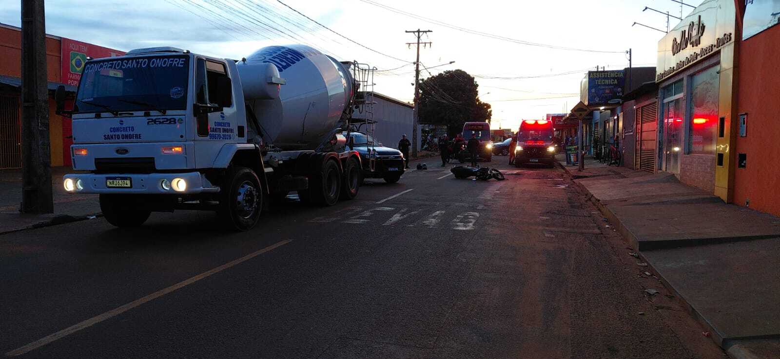 Motociclista derrapa em quebra-molas e é atingido por caminhão de concreto