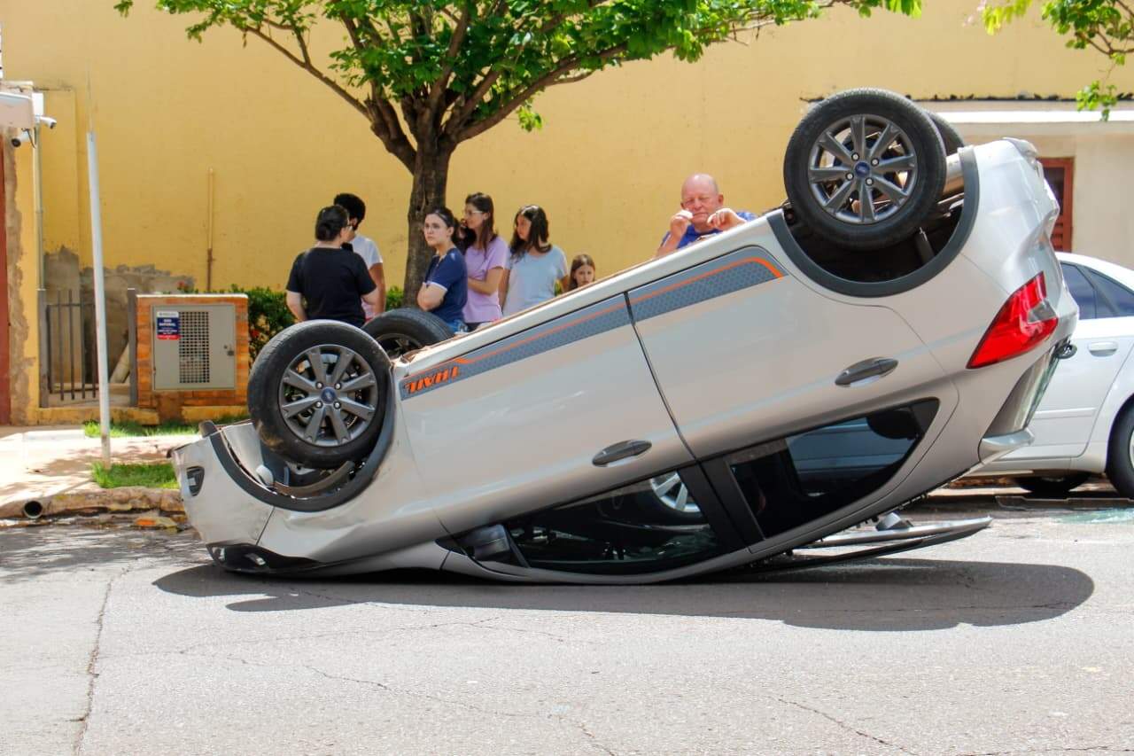 Motorista capotou o carro após bater em três veículos estacionados no cruzamento da Rua José Antônio com a Rua das Paineiras, na região central de Campo Grande, no início da tarde desta segunda-feira (3). O Ford Ka, que ela conduzia, atingiu uma Saveiro de uma empresa de energia, um HB20 sedã e um Chevrolet Prisma.