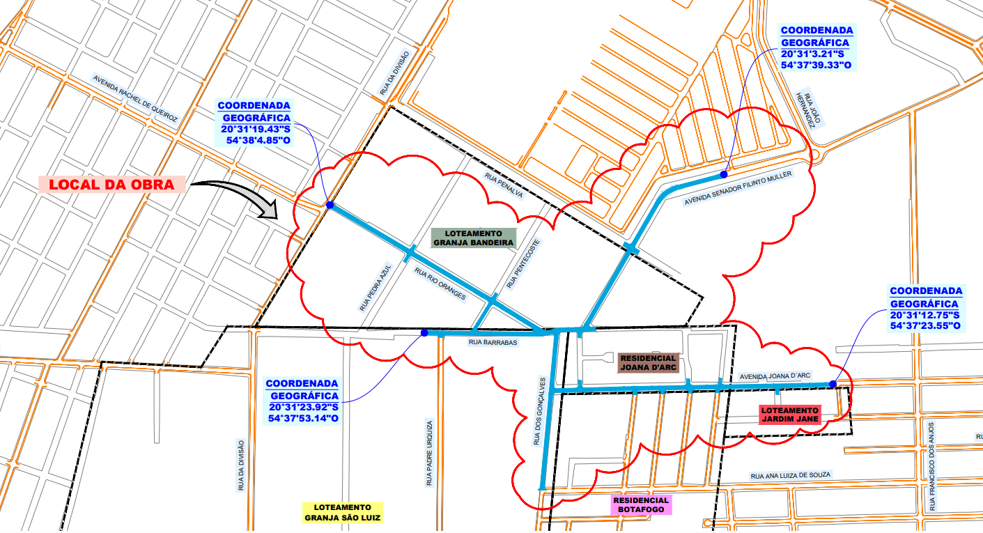 De acordo com o projeto, as vias que receberão asfalto e obras de drenagem são: Avenida Joana d’Arc, Avenida Senador Filinto Müller, Rua Barrabás, Rua dos Gonçalves, Rua Pentecoste e Rua Rio Oranges.