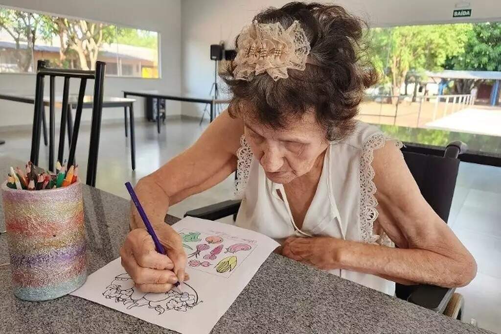 Idosa fazendo trabalhos com pintura no Asilo São João Bosco, uma das entidades contempladas (Foto: Divulgação/Alems)