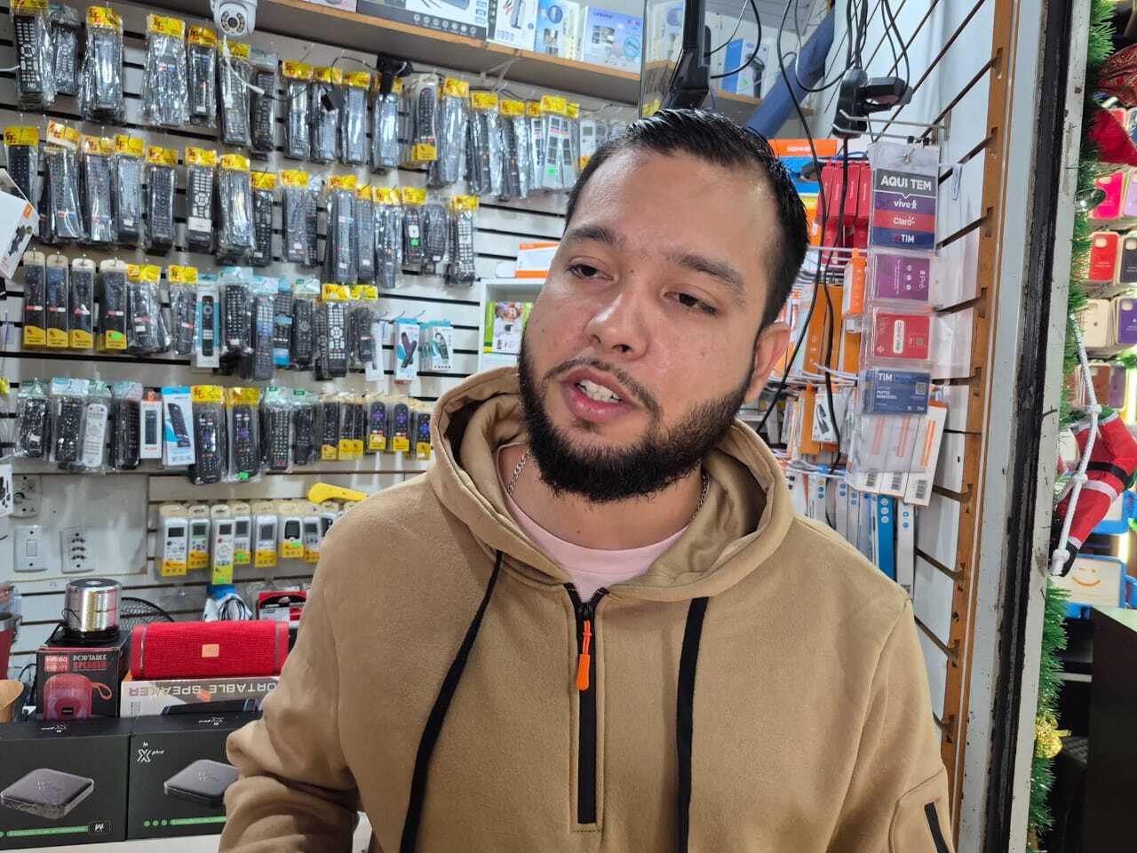 Carlos Eduardo de Souza Costa, que trabalha em um box de eletrônicos, avalia que a greve no transporte coletivo reduziu o público presencial, enquanto a chuva dificulta as entregas das vendas online.