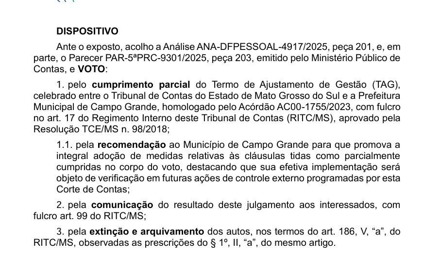 Acórdão do TCE/MS (Tribunal de Contas de Mato Grosso do Sul), publicado nesta segunda-feira no Diário Oficial, aponta que a Prefeitura de Campo Grande cumpriu apenas parcialmente as cláusulas do TAG (Termo de Ajustamento de Gestão) firmado com a Corte em 2023. O acordo previa a regularização das folhas de pagamento do município referentes aos meses de janeiro a setembro de 2022, enviadas pelo SICAP (Sistema de Controle de Atos de Pessoal), além de outros ajustes administrativos.