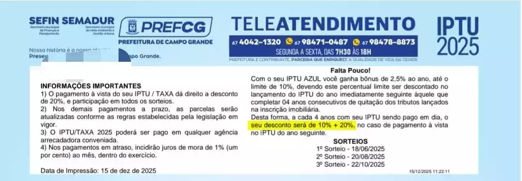 Contribuintes de Campo Grande têm relatado erros no aplicativo e no site da Prefeitura ao consultar informações sobre o IPTU (Imposto Predial e Territorial Urbano), especialmente em relação ao desconto concedido para pagamento à vista. Apesar de a legislação ter reduzido o abatimento de 20% para 10%, o sistema ainda exibe informações desatualizadas, o que tem gerado confusão.