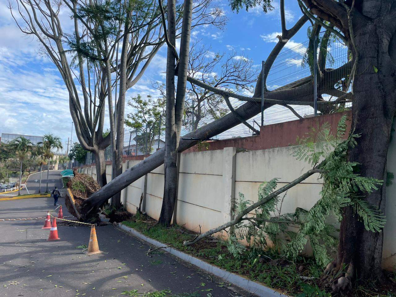 Árvore de médio porte, localizada dentro do Shopping Norte Sul Plaza, foi arrancada pela raiz durante o temporal que atingiu Campo Grande no domingo (2). O tronco tombou sobre a via, atingiu a fiação elétrica e bloqueou totalmente a Rua Japão, no Bairro  Jockey Club.