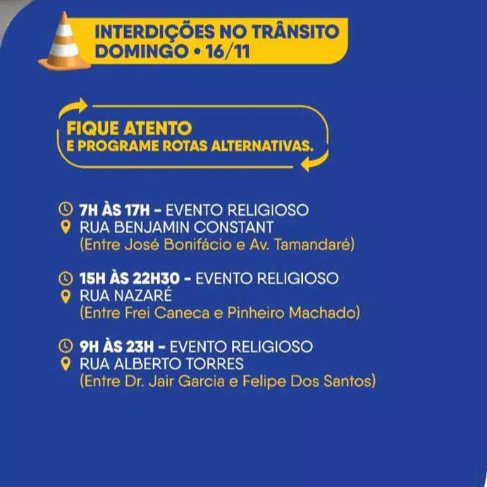 Moradores e motoristas que circulam por Campo Grande terão um domingo (16) com mudanças importantes no trânsito. As interdições serão motivadas por eventos religiosos em diferentes regiões da cidade.