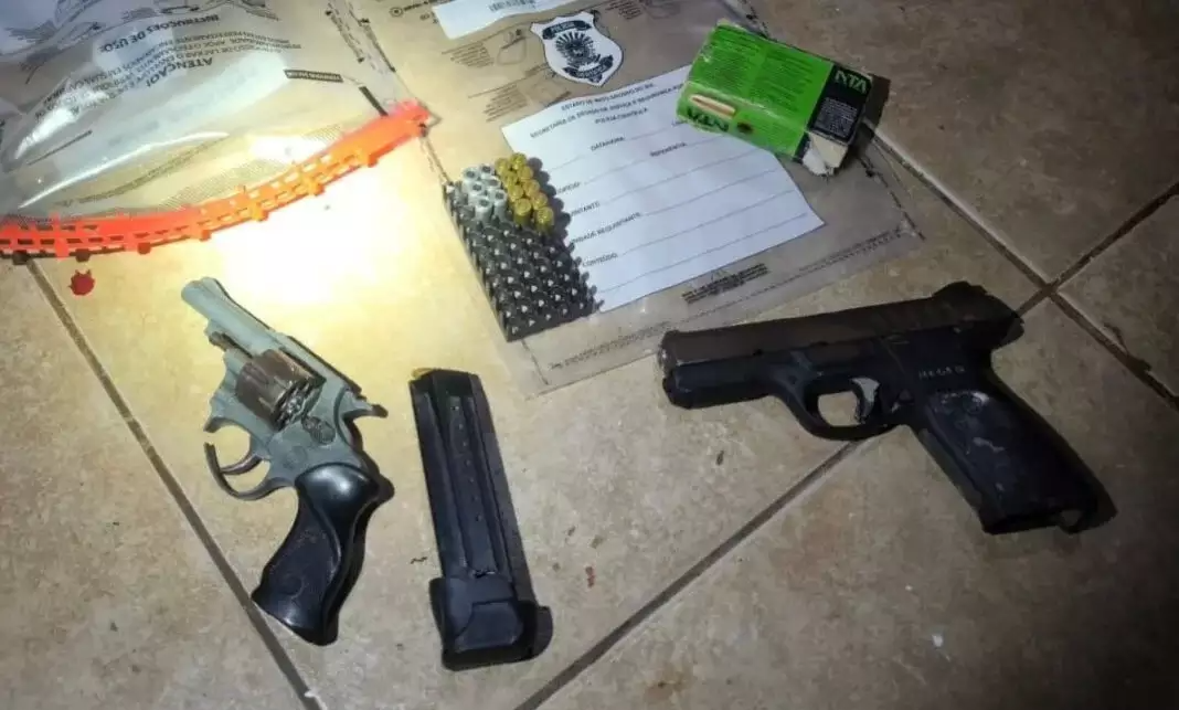 Durante a averiguação no local, os policiais apreenderam uma pistola calibre 9 mm com carregador contendo 18 munições intactas, além de um revólver calibre 22 com seis munições intactas. Também foram encontradas outras munições calibre 9 mm.