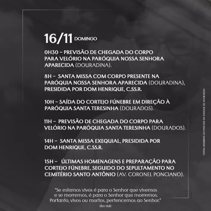 A previsão é que o corpo chegue à Paróquia Nossa Senhora Aparecida, em Douradina, às 0h30, onde terá início o velório. Às 8h, será celebrada a Santa Missa com o corpo presente, presidida por Dom Henrique, da Congregação do Santíssimo Redentor.