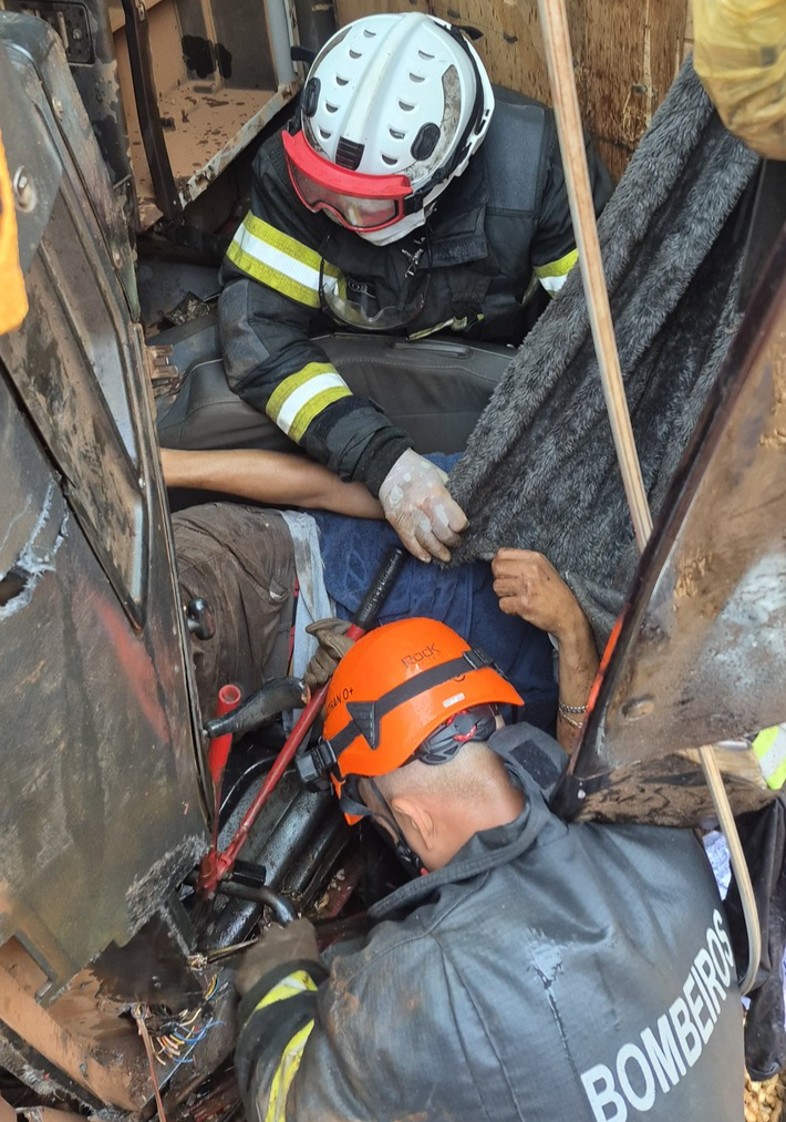 Dentro da cabine estava o motorista preso às ferragens. O painel do veículo havia comprimido a perna esquerda da vítima, impedindo que ela saísse sozinha.
