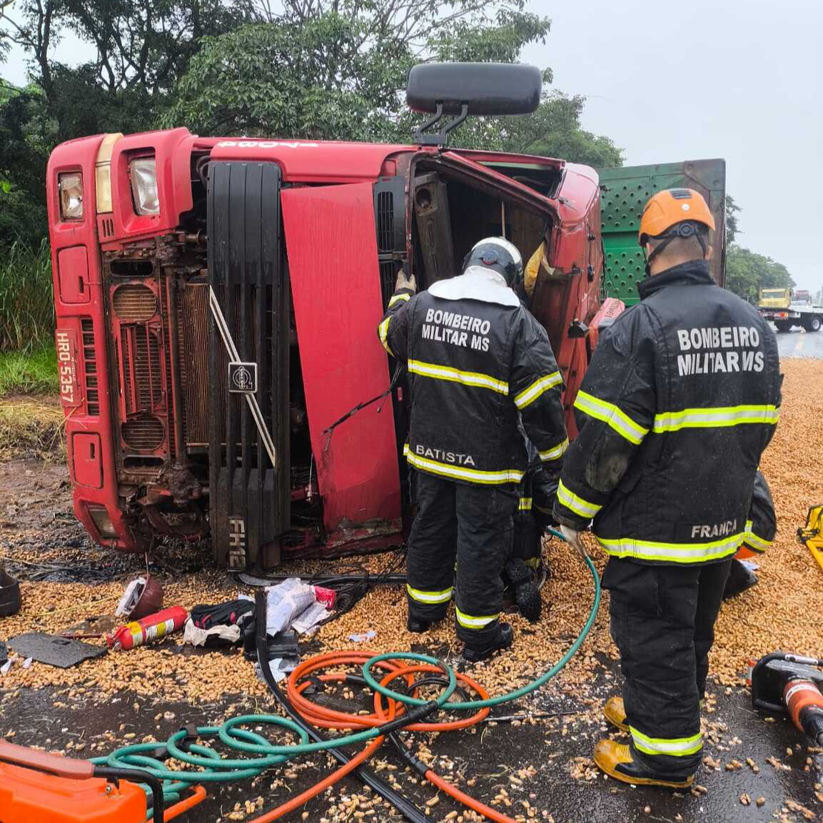 O Corpo de Bombeiros foi acionado por volta das 08h30 para atender a ocorrência de trânsito. No local, as equipes encontraram um caminhão tombado às margens da rodovia. O veículo transportava uma carga de amendoim que saiu de Santa Rita do Pardo, com destino à cidade de Tupã (SP).