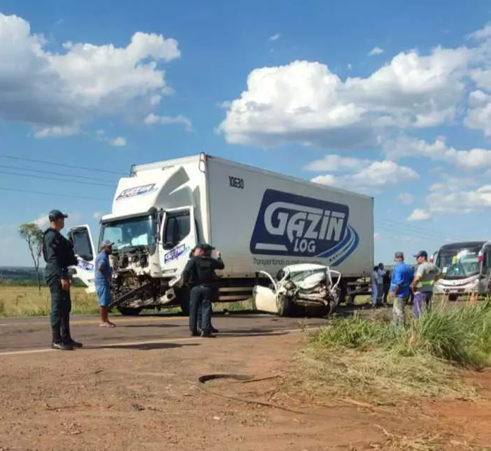 As imagens registradas por motoristas que passavam pelo local mostram a violência da colisão. O Gol ficou completamente destruído na parte frontal e parou atravessado na pista. Já o caminhão teve a parte dianteira arrancada com o impacto.