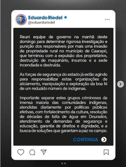 O governador afirmou que é importante separar os “grupos criminosos da imensa maioria das comunidades indígenas, atendidas por políticas públicas efetivas”. Riedel diz que não irá retroceder no combate efetivo “aos que alimentam o caos, criam dissensões, exploram a miséria”.