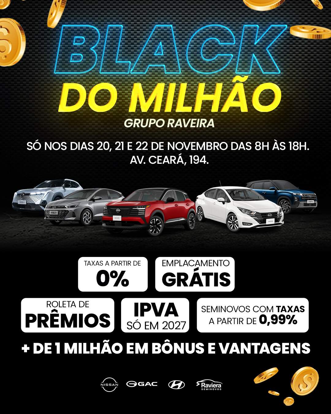 O grande destaque da campanha "Black do Milhão Grupo Raviera" são os preços especiais e vantagens que incluem veículos selecionados com emplacamento grátis, unidades com IPVA só em 2027, taxas a partir de 0% para novos e seminovos com taxas a partir de 0,99%.