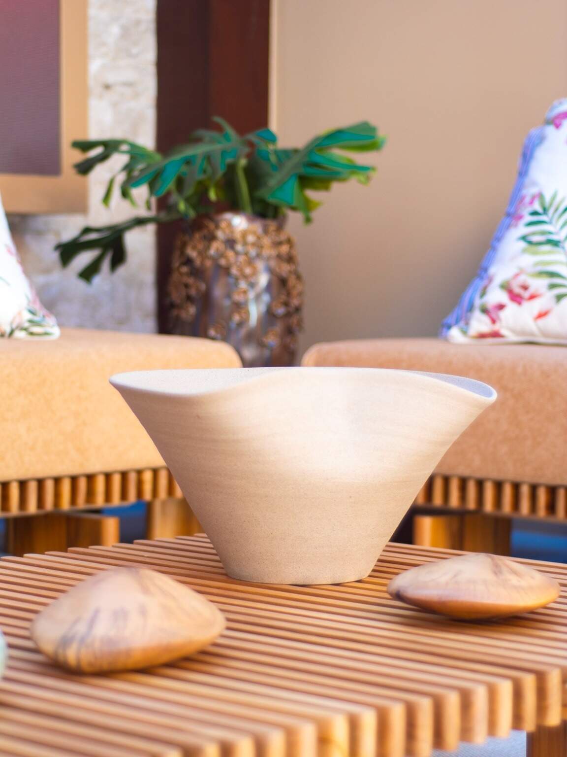 “No mobiliário, destacamos a Poltrona Carteiro Outdoor, assinada por Bruno de Carvalho, e o sofá Bello Outdoor, de Ricardo Bello Dias, ambos da +55 Design. Nas mesas de apoio, usamos a peça central do Metro Arquitetos e a Mineral, do Arthur Casas, ambas em concreto bege. A escultura é de Rafa Preto, fornecida pela Galeria 67, enquanto outros objetos de decoração vêm da Milano Home”, pontua.
