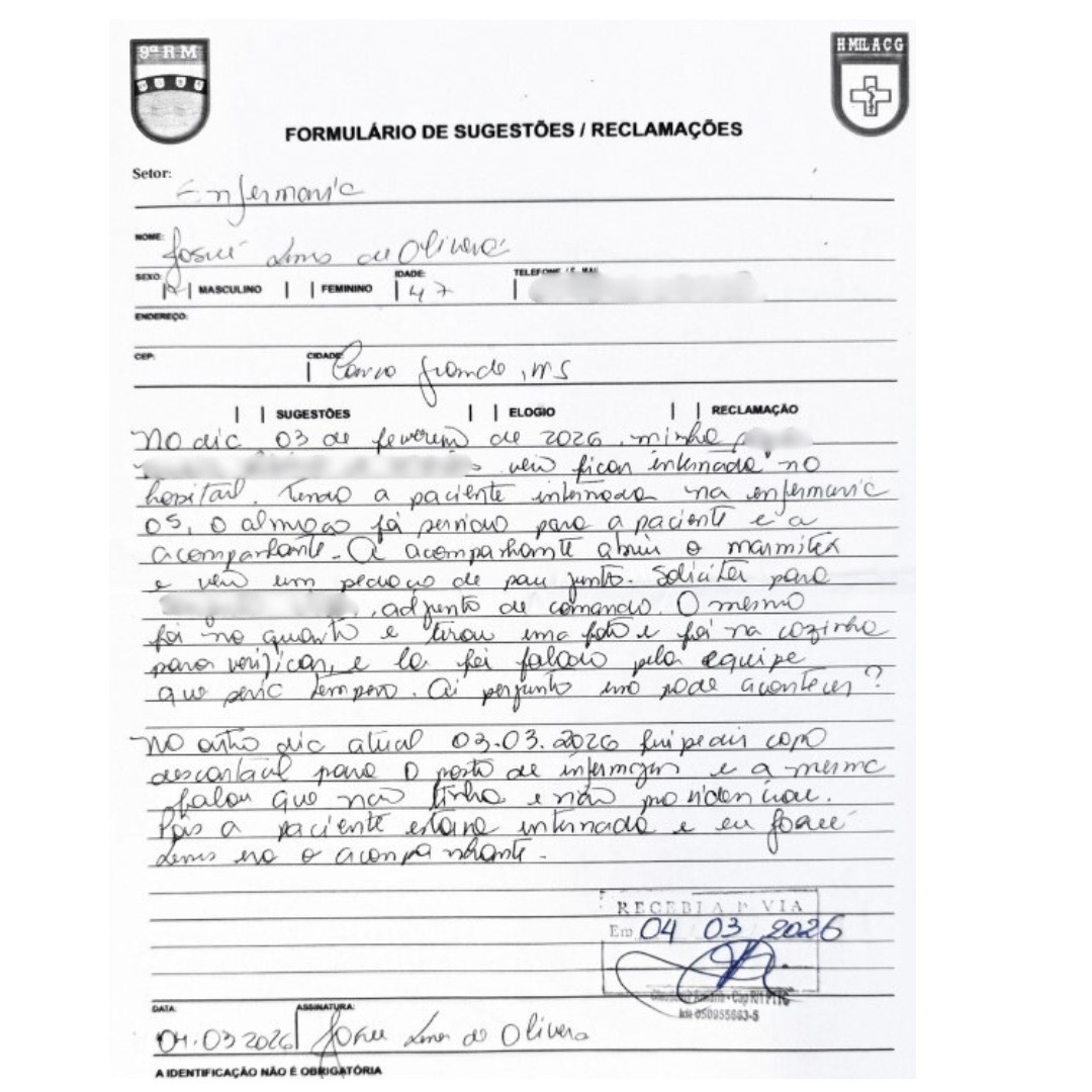 O Hospital Militar de Campo Grande enfrenta críticas devido à falta de equipe de triagem e más condições de equipamentos de acessibilidade. A denúncia parte do professor Josué Lemes, que acompanha o tratamento da sogra, de 67 anos, usuária do plano de saúde do Exército (Fusex). Entre os problemas relatados estão a ausência de classificação de risco no pronto atendimento, equipamentos de acessibilidade com necessidade de manutenção e falhas no serviço de alimentação. O caso foi reportado à Ouvidoria da instituição e ao Ministério Público Militar em Brasília. O Comando Militar do Oeste, responsável pela unidade, foi questionado sobre as denúncias.