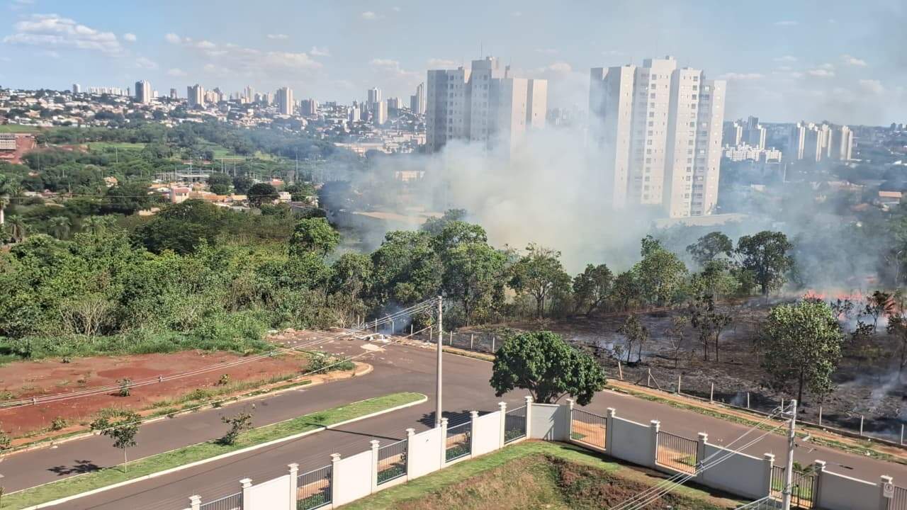 O fogo tomou conta da vegetação que fica localizada entre as ruas Alfredo Nobel e Ciro Macuco, em frente ao Condomínio Castel Di Veneza e próximo ao Residencial Belvedere.