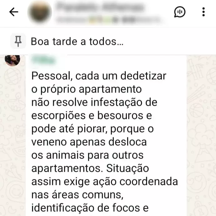 Há também manifestações contrárias às soluções individuais. Um condômino alerta que a dedetização isolada de apartamentos não resolve infestações de escorpiões e besouros e pode agravar a situação ao deslocar os animais para outras unidades. Ele defende uma ação coordenada nas áreas comuns, com identificação de focos e vistoria dos órgãos competentes.