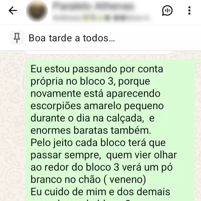 Morador do bloco 3 afirma que passou a agir por conta própria após identificar a presença recorrente de escorpiões amarelos de pequeno porte durante o dia, além de baratas de grande tamanho. Segundo ele, a aplicação de veneno no entorno do prédio resultou em um pó branco visível no chão. “Eu cuido de mim e dos demais moradores do bloco 3”, escreveu, acrescentando que, sem ações individuais, os animais peçonhentos podem se tornar uma epidemia dentro do condomínio.