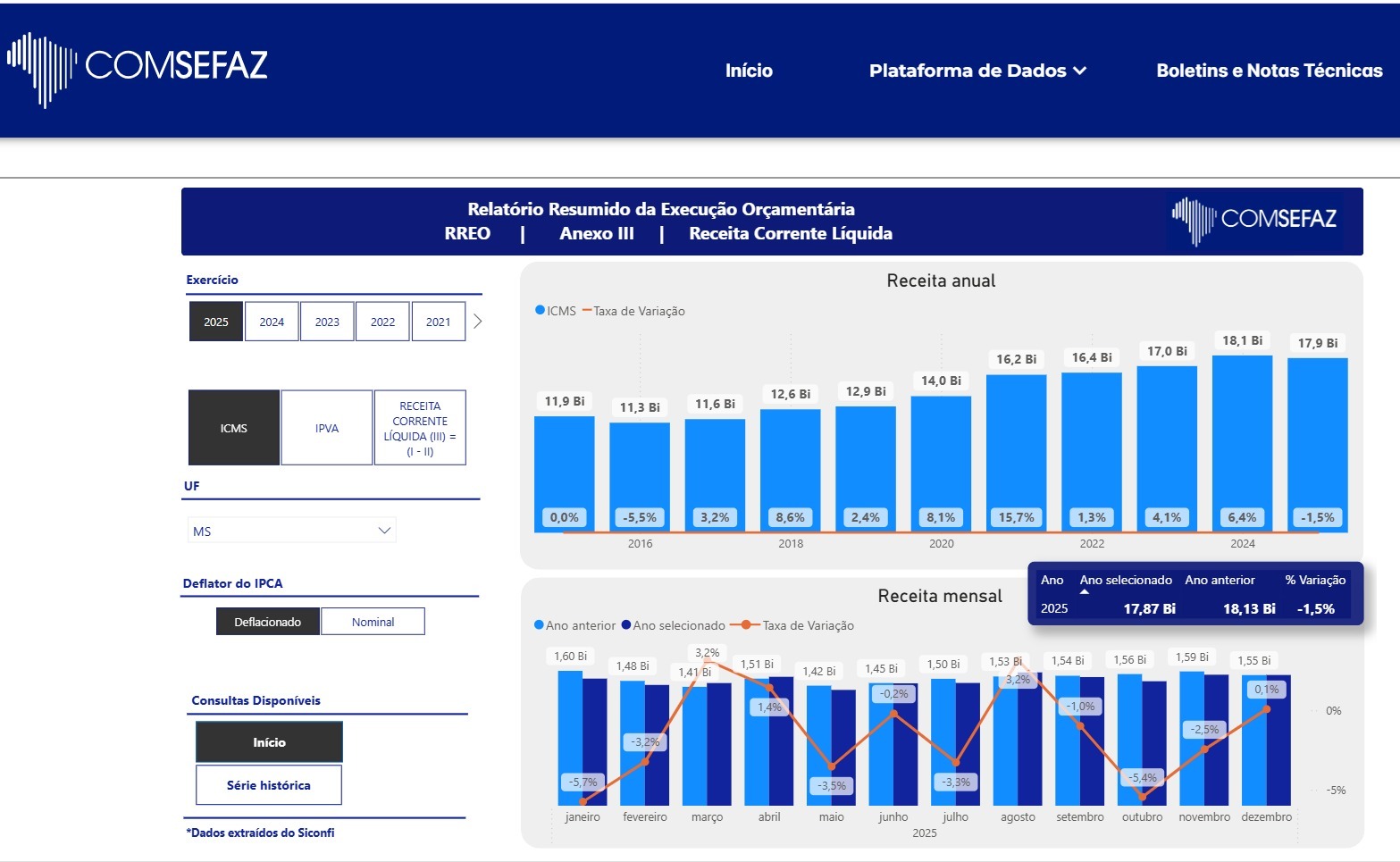 O entendimento é de que a receita anual do ICMS cheio segue sólida no estado, apesar do recuo pontual. Em 2025, o ICMS estadual somou R$ 17,9 bilhões, queda de 1,5% frente aos R$ 18,1 bilhões arrecadados em 2024, conforme dados do Comsefaz (Comitê Nacional de Secretários de Fazenda, Finanças, Receita e Tributação dos Estados e Distrito Federal), com base no RREO (Relatório Resumido da Execução Orçamentária) do estado, deflacionados pelo IPCA, divulgados na última sexta-feira.
