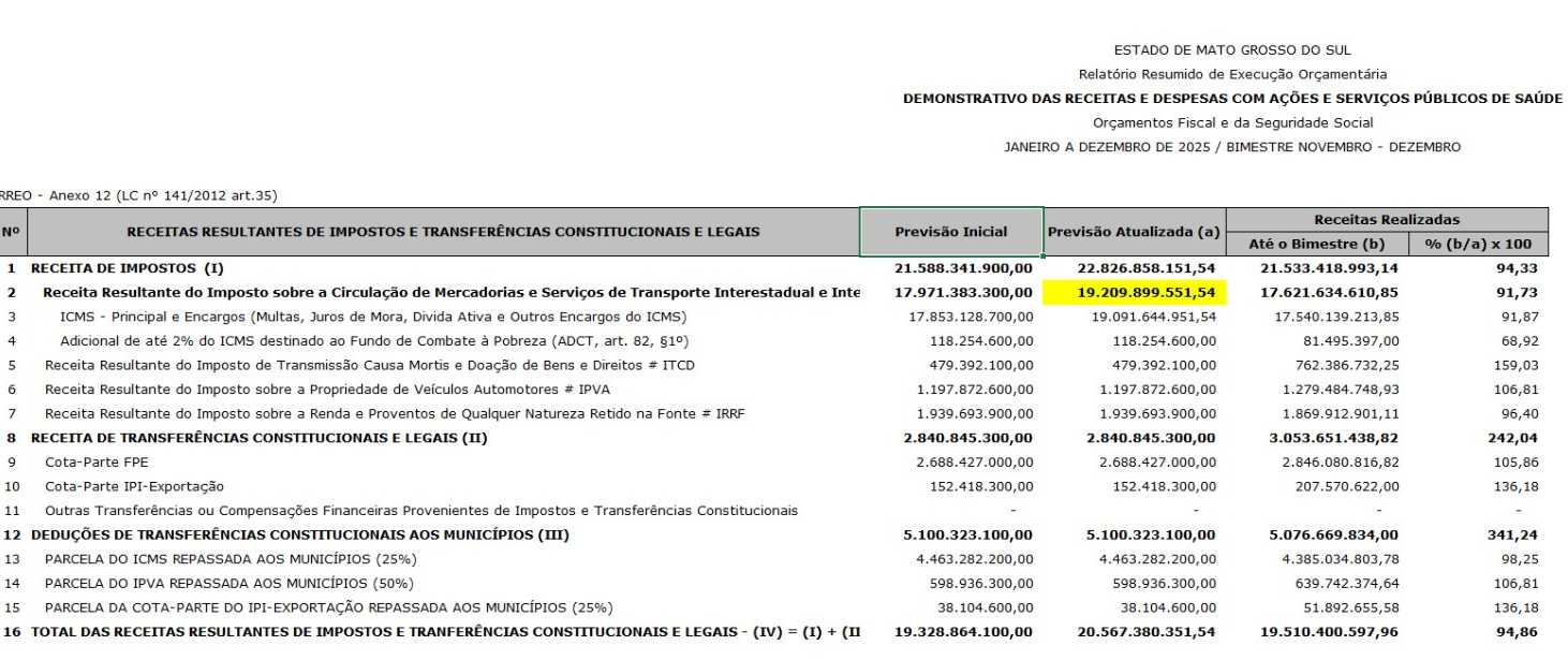 O RREO do último bimestre de 2025 indica que a previsão inicial de ICMS era de R$ 17,971 bilhões, posteriormente atualizada para R$ 19,209 bilhões. Ao final do exercício, a arrecadação efetiva somou R$ 17,621 bilhões.