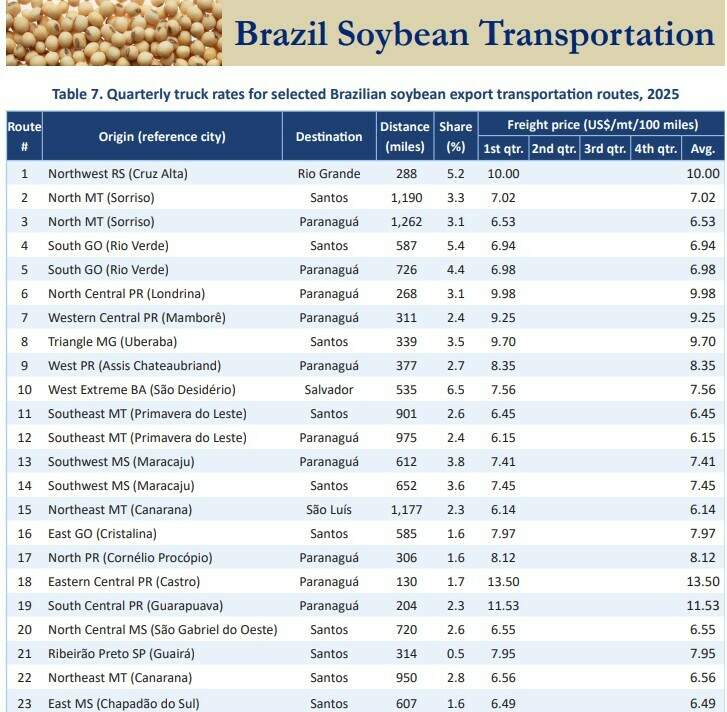 Nessas ligações, o custo médio de transporte variou entre US$ 6,49 e US$ 7,45 por tonelada a cada 100 milhas, abaixo da média nacional de US$ 7,60 registrada no primeiro trimestre de 2025. Essa diferença garante ao Estado vantagem logística frente a outros concorrentes e reforça sua posição estratégica na exportação do grão.