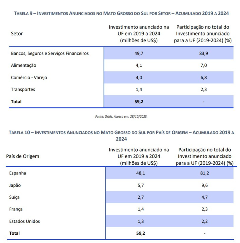 O levantamento, com 39 páginas, mostra que o Estado recebeu US$ 59,2 milhões em IED no período de 2019 a 2024, o equivalente a R$ 318,6 milhões, considerando a cotação atual do dólar. A maior parte desses recursos teve origem na Espanha, responsável por quase metade dos valores aplicados em Mato Grosso do Sul (48,1%), somando US$ 48,1 milhões (R$ 258,8 milhões), impulsionados pelo plano de expansão de agências bancárias do Santander no Brasil.