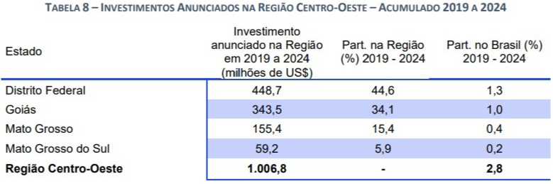 O Distrito Federal liderou no Centro-Oeste, com 44,6% do IED regional e 1,3% do total brasileiro. Goiás ficou em segundo lugar, com 34,1% do IED regional e 1% do nacional. Mato Grosso apareceu na sequência, com 15,4% e 0,4%, respectivamente.