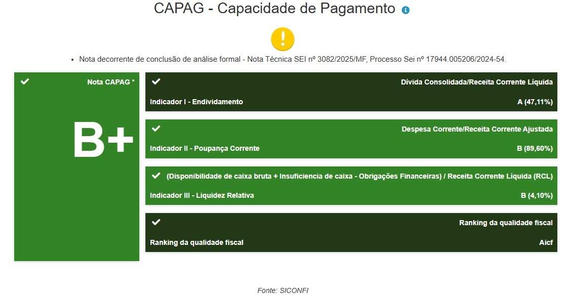 A transparência do Tesouro Nacional através da Capag (Capacidade de Pagamento) revela que a nota caiu para B+ porque houve aumento de uso das receitas disponíveis para cobrir despesas correntes (folha de pagamento, manutenção, etc.).