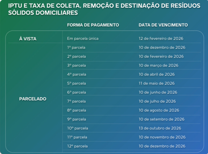 Cronograma com os vencimentos das parcelas do IPTU 2026 em Campo Grande.