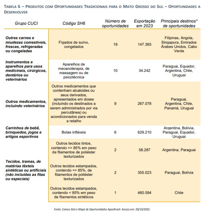 Em meio ao avanço do protecionismo global, liderado pelos Estados Unidos e, mais recentemente, pelas cotas adotadas pela China para a carne bovina, um estudo da ApexBrasil (Agência Brasileira de Promoção de Exportações e Investimentos) aponta um amplo leque de oportunidades tradicionais de exportação para Mato Grosso do Sul. Ao todo, foram identificadas 2.237 oportunidades, distribuídas em 48 setores e 76 produtos, com alcance potencial em 196 países.