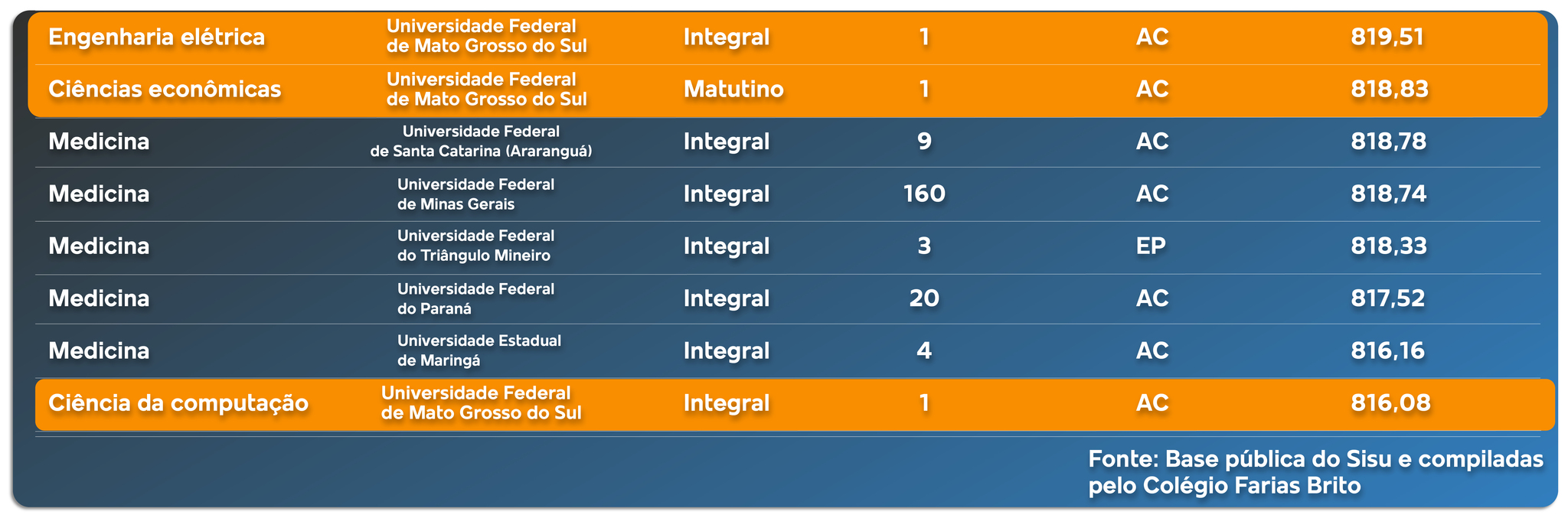 As notas divulgadas foram extraídas da base pública do Sisu e compiladas pelo Colégio Farias Brito. Como o sistema é atualizado diariamente, os valores podem subir ou cair até o encerramento do prazo de inscrições. A classificação final só será conhecida após o fechamento do sistema e a divulgação oficial dos resultados pelo MEC (Ministério da Educação).