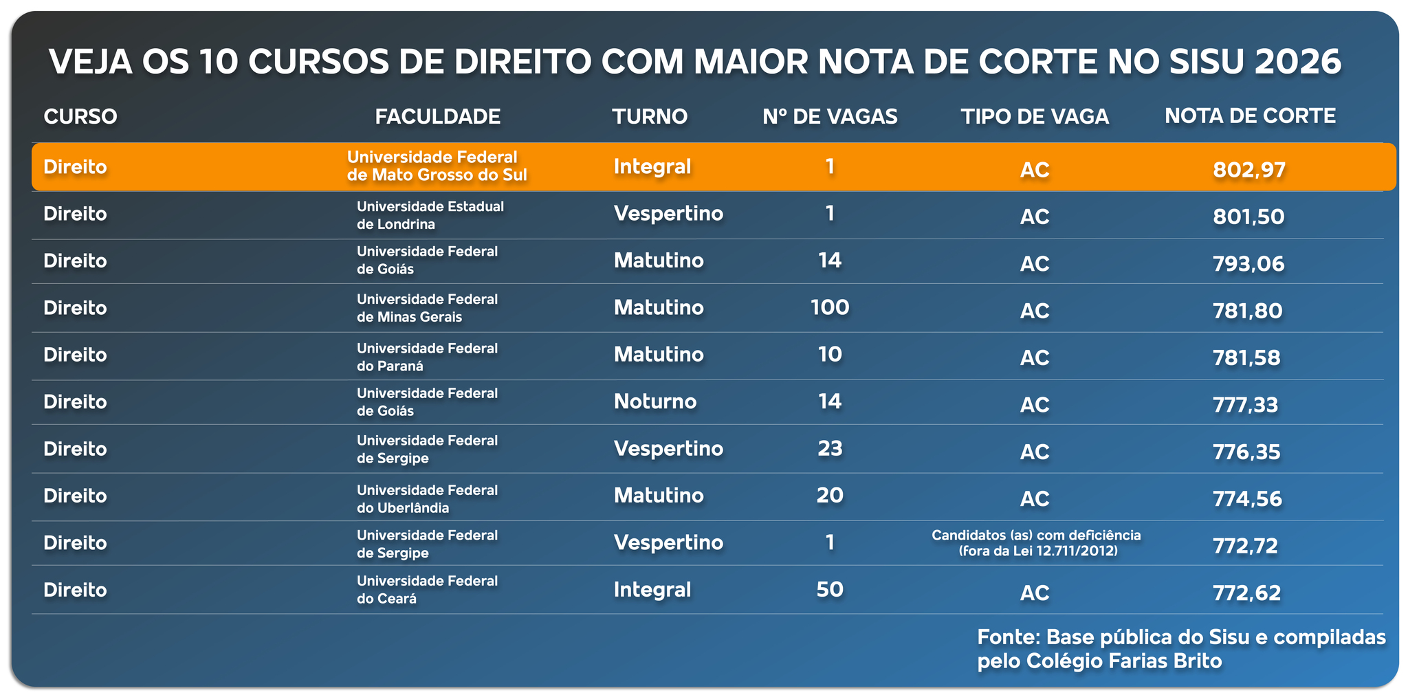 O curso de Direito da UFMS, em turno integral, alcançou nota de corte de 802,97 pontos na modalidade de ampla concorrência, a mais alta entre todos os cursos de Direito do país no primeiro dia do Sisu 2026. O resultado coloca a instituição sul-mato-grossense à frente de universidades tradicionais como a Universidade Estadual de Londrina, a Universidade Federal de Goiás e a Universidade Federal de Minas Gerais.