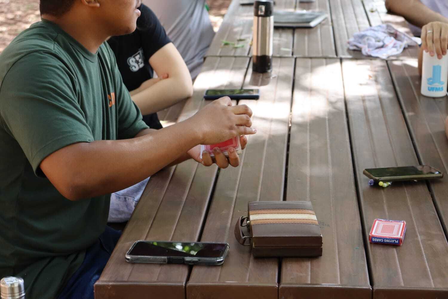 Alunos do curso de Engenharia Física jogam baralho do lado de fora da sala enquanto esperam o retorno da luz. Kariny Camargo, 20, está no 6º semestre e teria aula às 9h. "Não conseguimos conseguimos recarregar nosso computador, a universidade fica sem internet e a sala fica quente. Os professores acabam não dando aula. Outra vez aconteceu e um professor começou a aula, mas durou 10 minutos e nos dispensou", ela lembra.