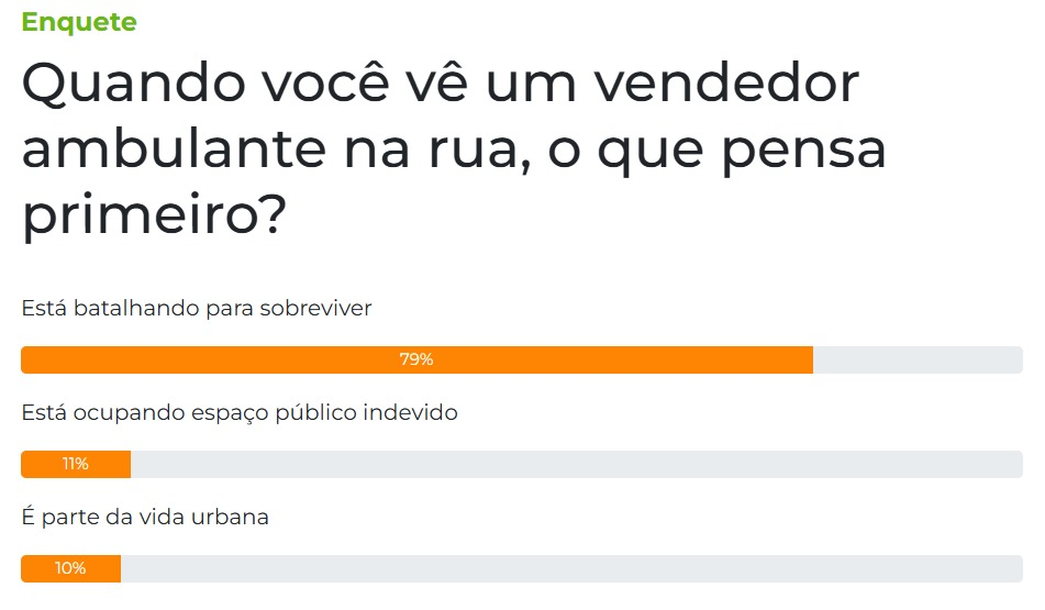 Para 11% dos leitores, o primeiro pensamento ao ver um vendedor ambulante é que ele “está ocupando espaço público indevido”. Em contrapartida, a maioria (79%) acredita que essas pessoas “estão batalhando para sobreviver”. Outros 10% disseram que os ambulantes “já são parte da vida urbana”.