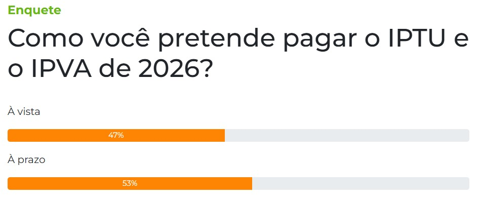 A maioria dos leitores afirma que pretende pagar o IPTU (Imposto Predial e Territorial Urbano) e o IPVA (Imposto sobre a Propriedade de Veículos Automotores) de forma parcelada em 2026. O resultado da enquete deste domingo (21) aponta que 53% devem optar pelo pagamento a prazo, enquanto 47% dizem que pretendem quitar os tributos à vista.