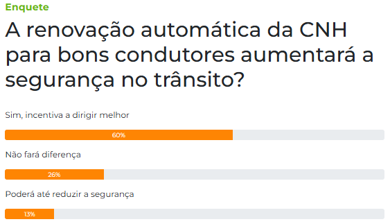 Para a maioria dos leitores (60%), a renovação automática da CNH (Carteira Nacional de Habilitação) aumentará a segurança no trânsito, pois incentiva a dirigir melhor. Outros 26% afirmaram que a mudança não influenciará na segurança, enquanto apenas 13% acreditam que ela pode reduzir a segurança. O resultado foi obtido por meio da enquete do Campo Grande News desta quarta-feira (10).