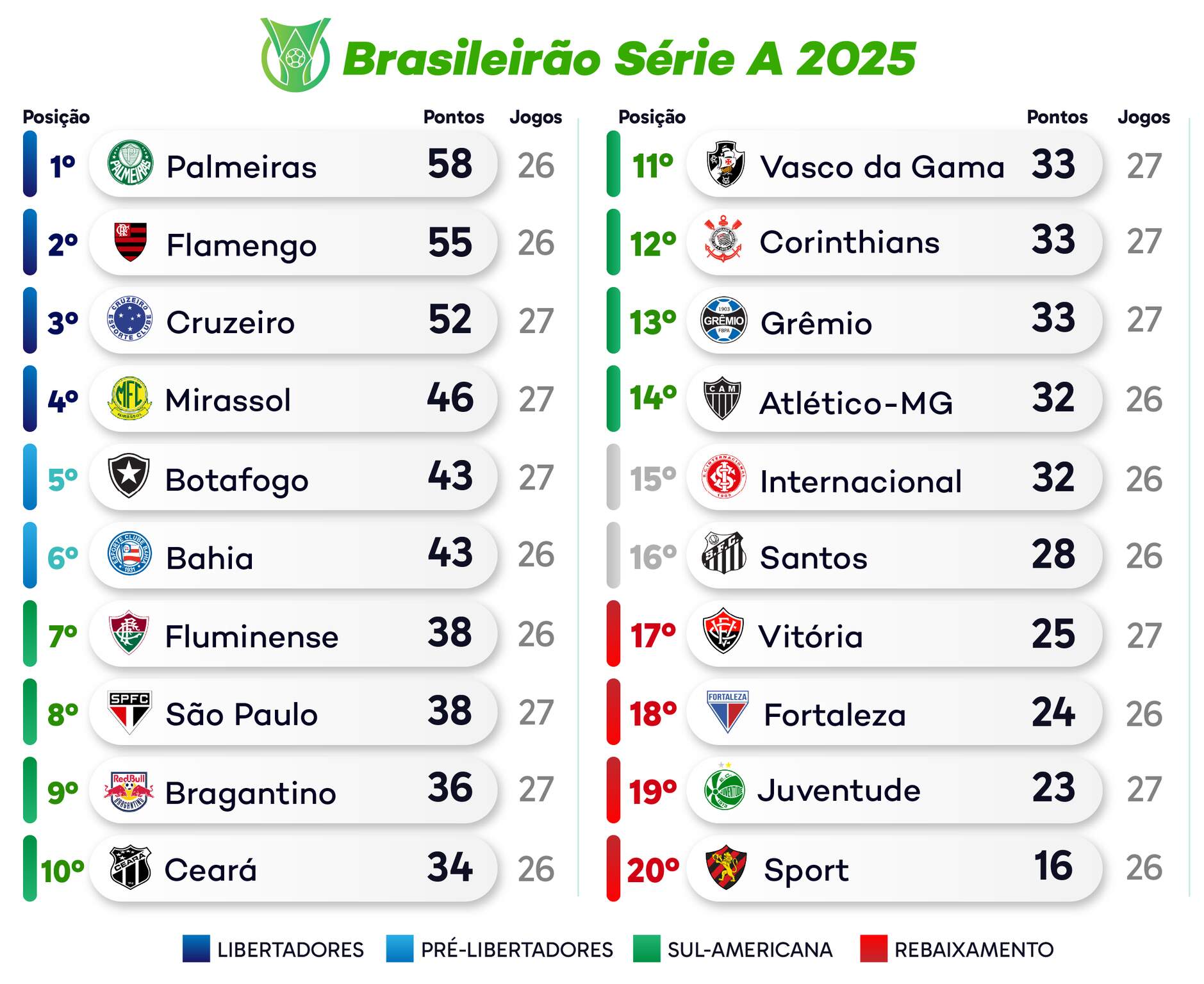 O Campeonato Brasileiro retorna nesta quarta-feira com sete partidas pela 28ª rodada, destacando-se os clássicos entre Botafogo e Flamengo, no Engenhão, e Santos e Corinthians, na Vila Belmiro. O líder Palmeiras recebe o Red Bull Bragantino no Allianz Parque.A rodada também conta com os confrontos Sport x Ceará, Mirassol x Internacional, Fortaleza x Vasco e Atlético-MG x Cruzeiro. Paralelamente, Corinthians e Ferroviária disputam vaga na final da Libertadores Feminina, em Buenos Aires.
