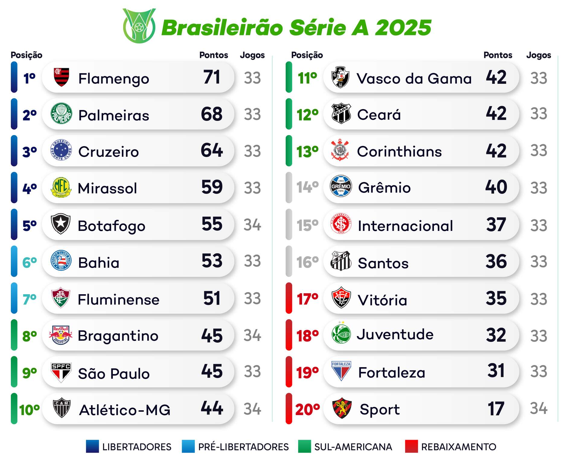 O time carioca lidera a disputa com 71 pontos, três pontos à frente do Verdão. Cruzeiro, com 64 pontos, Mirassol, com 59, e Botafogo, com 55, fecham o G5, grupo de acesso à fase de grupos da Libertadores da América.