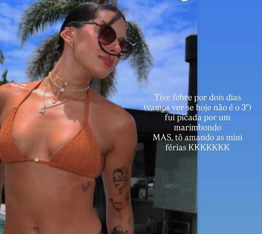 Além do relato em vídeo, Ana Castela também falou sobre o episódio na legenda de uma foto publicada nas redes sociais. “Tive febre por dois dias (vamos ver se hoje não é o 3º). Fui picada por um marimbondo, mas estou amando as mini férias”, escreveu.